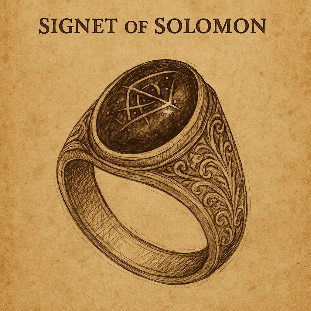 Known as the Signet of Solomon, this legendary ring is depicted as an ancient seal, often symbolized by a six-pointed star. In Talmudic tradition, it is said that the ring bore the sacred name of God (YHVH), endowing Solomon with the power to subdue both jinn and spirits.
